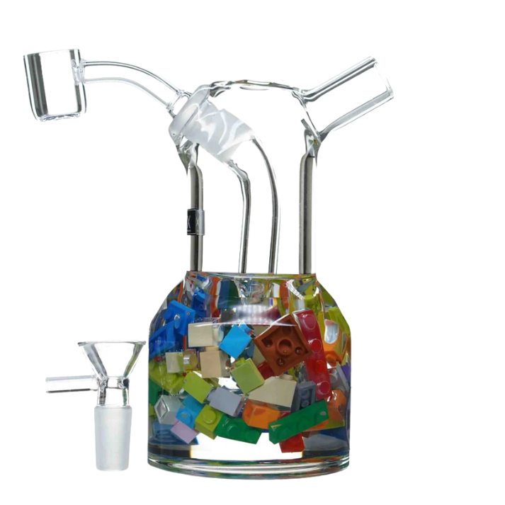 Each piece is available in three distinct themes: Candy Hearts, Classic Legos, or Floral Rose designs. Every bong is one-of-a-kind and exceptionally difficult to craft. Unlike standard beakers, these resin-fused glass bongs undergo extra steps to achieve their stunning appearance.
